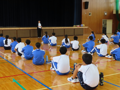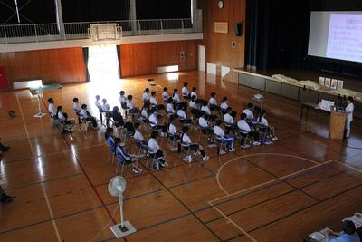 校長先生からは、今年が戦後80年の節目であることにふれ、平和の大切さについてのお話がありました。また、3年生にはいよいよ受験に向けた学習にしっかりと取り組んでいくこと、そして2学期には合同運動会や文化祭など多くの学校行事があるため、仲間と力を合わせて取り組んでほしいという励ましの言葉をいただきました。さらに、この夏各地で発生した豪雨災害にもふれ、自分たちの生活を見直し、日常を大切に過ごすことの重要さについて考える時間となりました。